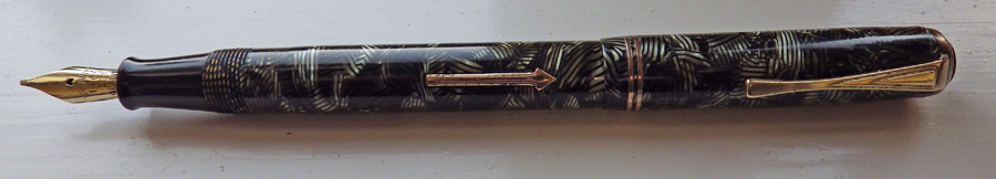 Wyvern models are confusing and they are likely to remain so until someone does major work on them. This No 50, when compared with other Wyverns, seems to be a mid-thirties pen. It has the rather stylish Art Deco clip, double cap bands and the usual arrow-shaped lever. With the cowled clip and black “jewel”, it’s one of the better Wyverns, enhanced by the hatched pattern. As is usual with Wyverns, the gold plating has worn almost completely off the clip.