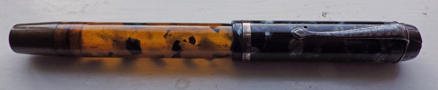 This is a Mentmore Autoflow, one of the better British pens. It started out blue and black marbled, as the cap remains but something happened to the barrel. It has become translucent amber with traces of the original marbled pattern remaining. I’ve seen this several times before, mostly on Mentmores but sometimes on other pens. British-made Watermans of the thirties are susceptible.