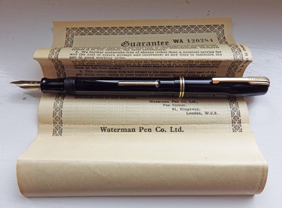 I haven’t had one of these for quite some time. It’s an English Waterman Ideal, quite large at 13.2 cm, an altogether substantial pen. It was made in the late forties and has been well looked after; the box and papers are in good condition like the pen itself. Neither the barrel imprint nor the nib engraving give any hint as to the name or model number of the pen.