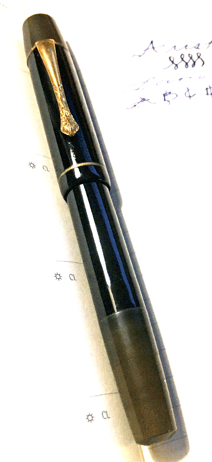 This elegant pen is an Aristokrat. No-one seems to know very much about this company, even among German pen enthusiasts – it is undoubtedly German. Some say Aristokrat has some relationship with Soennecken, others say that this is untrue. The company seems to have been based in Fuerth, near Nuremberg. Hard rubber and celluloid – and maybe moulded plastic – pens continued to be made until as late as the sixties.