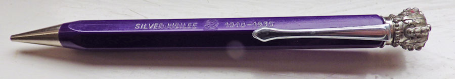 This pencil commemorates twenty-five years of the reign of George V, his Silver Jubilee. It is purple, the colour associated with royalty. Most noticeable is the finial in the shape of a crown.