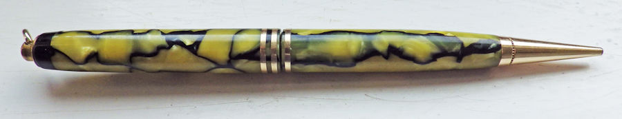 When Parker decided that it was necessary to produce cheaper pens – and pencils – during the hard times of the thirties, they did so without reducing quality and they enhanced those writing instruments with wonderful patterns. This green pearl with black lines pencil is one of those beauties that they produced. I wouldn’t want to overstate the case, but I think that it isn’t unreasonable to say that those glorious pens and pencils brightened those dark days for some.
