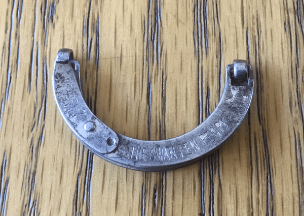 It says “Compliments of the Swan pen people” It is hinged so it can fold in half, also it has a spring catch on one of the hinges so it can open up. It’s just over one inch in diameter.