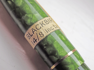The barrel imprint has moved to near the section and reads Mabie Todd and Co Ltd. Made in England with no mention of Blackbird. The pen is identified as a Blackbird on the section and nib.