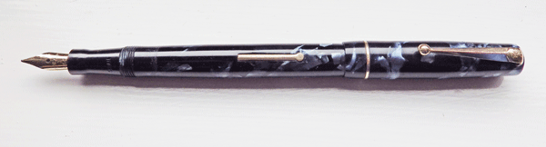 I don’t believe I’ve written about the 6142 before. Surprising because it was a popular pen and they appear quite often. It’s one of those patterns that moves with the light. At one moment a small area looks almost black. You move the pen and the blue leaps out at you. The celluloid – they called it xylonite – that Mabie Todd used throughout the thirties and forties is tough stuff, strongly resistant to wear. As a result many of the pens of that period look like new. This one has retained its gold as well to complete the picture.