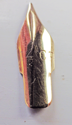 This tiny nib appeared in a Swan eyedropper that I bought. I swapped it out for a correct nib and I have hung onto it in the hope that it will eventually become clear which pen it began life with. It’s properly tapered for a split feed eyedropper filler but at 16.7 mm long it would be just swallowed up by any pen I can think of.