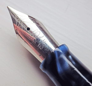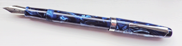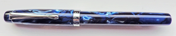 The blue marbled pattern is very bright and pretty. Acrylic marbling cannot match patterns in celluloid but this one comes close. The chrome goes with the blue very well. The pattern continues into the section. The section is quite thick, gently tapered and has a decisive “stop”. It’s really comfortable. The nib is a more generous fine than a Japanese fine. It’s nice and wet. No stinginess here!