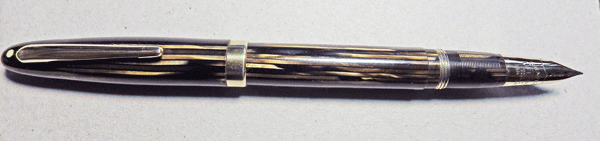 My favourite Sheaffer is a Jade Green Radite 7-30 from about 1928 in virtually mint condition. It’s a huge pen with a wonderful large nib and good colour. It’s clear that the cap and the barrel were drilled from different rods but there is no sign of the darkening that can turn especially barrels dark brown (some say its caused by gas being given off by the atrophying sac; I really don’t know). The pen is a great writer although the section is very, very slightly too great in diameter so that the feed bar and the nib sit too low and used to leak until Peter Twydle found a feed bar that was a better fit. I also have have an Imperial from the 1960s that weighs mere grams, has a beautiful nib and writes perfectly. A cartridge pen.