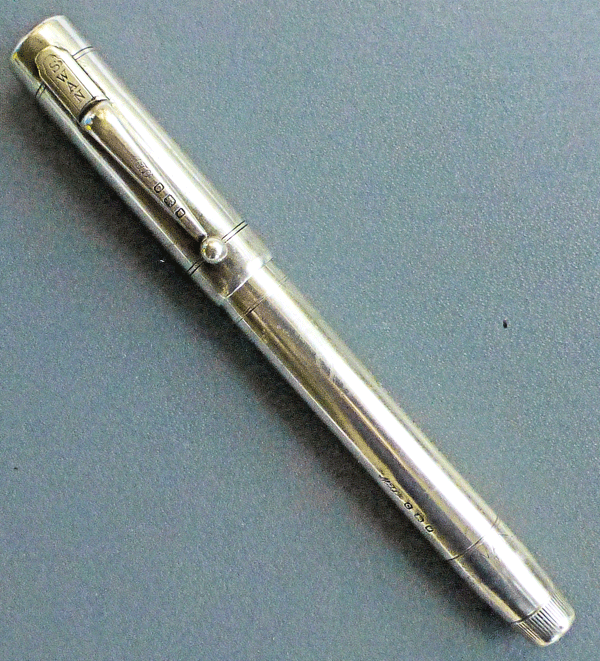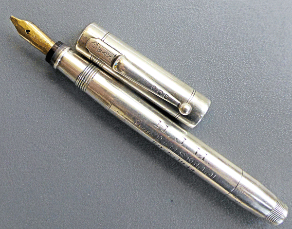 This model of Leverless was issued in 1938. The presentation date of this pen is 1944. It is imprinted, ‘HJM from David Mitchell,’ rather curiously making the donor more important than the recipient (could this have been an illicit romance?). The pen is hallmarked on the cap and barrel. It sports a wonderful stub nib, making it as delightful in use as it is ornamental.