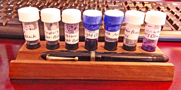 However a change was about to happen. My friend James sent me a rather different pen rest, one drilled out to accept ink sample bottles. This is useful in two ways: you need somewhere to store those little containers which are not very stable; secondly they provide the ideal means to fill a pen from those bottles. If you’ve ever tried to fill a pen from one on the desk you’ll realise how precarious a business it is. With the container firmly held in the pen rest filling becomes so much easier and safer.