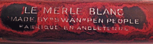The barrel imprint explains it all: Le Merle Blanc Made by “Swan” Pen People Fabrique en Angleterre. This handsome little pen is very uncommon nowadays, especially in mottled hard rubber.