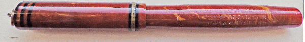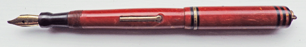 This one’s a bit special! It’s an American-made Swan 127/53 ring-top in the pattern known as Scarlet. To me it appears to be a rich russet with small paler flecks. There are black bands around the single cap band and three more at the top of the cap below the ring.