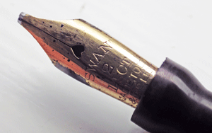 The pen was made in 1927, part of a range of black-banded pens in various sizes and colours. The pen’s a rarity here and perhaps not all that common in the US either. It isn’t only beautiful; it has an exceptional nib, a broad, flexible stub, finely shaped and precise. It lays down a lot of ink with lovely line variation.