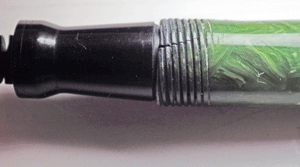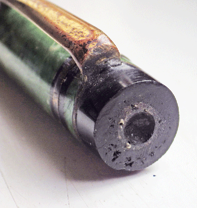 More seriously, there is a crack running through the barrel threads. I can make a repair of sorts but the only really secure solution would be a metal insert and the pen, though uncommon, is not rare or valuable enough to justify such work.