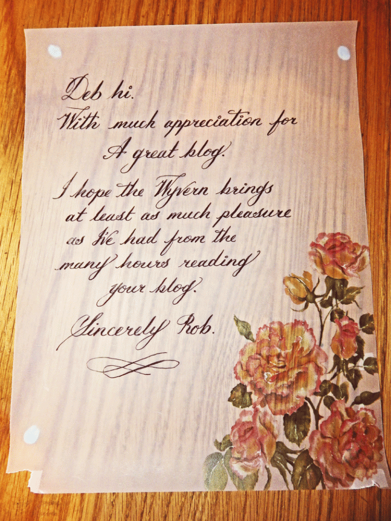 This isn’t the end of the story of this beautiful, generous gift. The accompanying letter is a thing of beauty in itself (the picture doesn’t do it justice). I cannot thank you enough, Rob. This pen will always be treasured.
