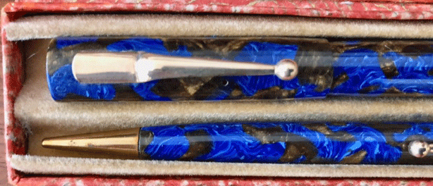 You may remember that a few weeks ago I got hold of a BB2/46 pen minus the cap. I was glad to get it even in that state because of the beauty of the bright blue material. I don’t know why these pens are such rarities. Perhaps they did not suit the taste of those times or maybe Mabie Todd only got a limited supply of the material.