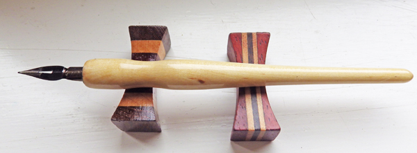I bravely chose a pointed nib, A Macniven & Cameron Waverley. It requires a delicate touch and feels somewhere between an everyday fountain pen nib and a paintbrush. Being very careful with the nib at first, until the nib took on a little polish, I managed to avoid digging into the paper or depositing any blots. This Waverley is a lovely nib and on the right paper I can write with it quite well. An interesting point: not all Waverleys have the tilted tip for which they are famed. This one’s just a straight, pointed nib. It’s capable of some flexibility – a semiflex, I’d say. But that’s more than I’m capable of.
