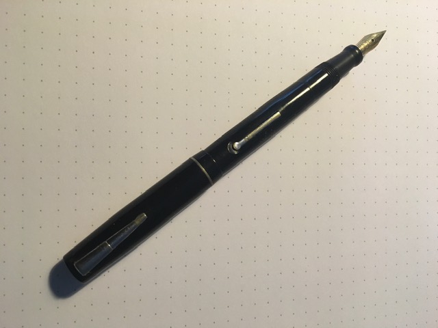 Jackdaws are the poor relations of Swans, the school pen of the Mabie Todd range. Both the nibs and the plating are thin. There was a period during the late thirties when they shared the colourful patterns of the Visofil but mostly they were rather plain pens.