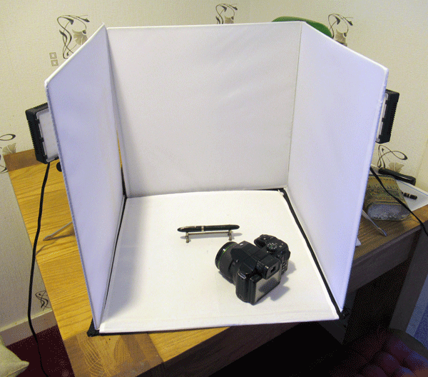 In the end I bought two table lights. These are quite powerful 60 LED lamps that light the setup quite well. They sit on extensible tripods, not the best idea in the world as the tripod legs prevent the lamp getting close to the light box. I may stop using the tripods and mount the lamps on small blocks instead.