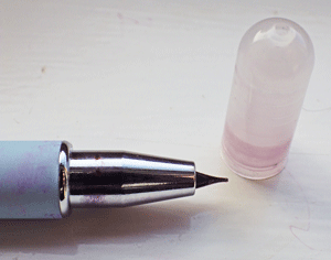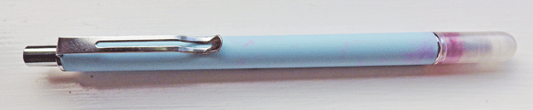 Let’s pretend that this issue doesn’t make the whole point of the pen redundant. Let’s pretend that it’s a rather good pen in most respects – which it is! It’s very light though it appears to be entirely made from metal – the site says stainless steel but I don’t know about that. The one I chose is painted or enamelled pale blue and the push-button and the clip are chromed. The nib is steel and the tipping is unlikely to be anything other than a steel blob at this price. The action of the retractable nib is very good and the cap fits well.