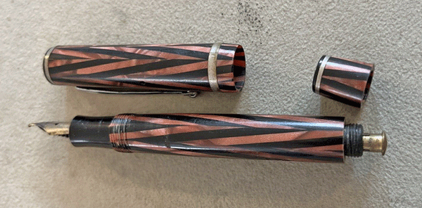 2. While I’ve never heard of the brand (and not surprised it is possibly a homage/clone pen from an earlier Italian company), that material might have stuck in your head for a reason. In the late 30s-40s, a number of pens were made with exceedingly similar plastics. The interesting part is that they are found in both high-and low-end pens. My two specific examples would be the Waterman Ink-Vue series, where they appended “Ray” to the color (as in Silver Ray). I think. And then you can find a number of different colors in this patter in Wearever pens of the time. As serendipity would have it, I was helping a new pen friend at our local pen club just yesterday to restore a Wearever like this in green.