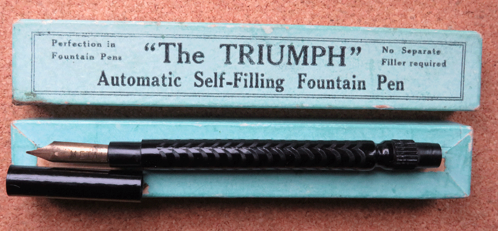The pen appeared as the Victoria or, as this one, Triumph. A later, similar pen was the Manos from Austria. I think it is fair to say that these pens are assisted dip pens rather than true fountain pens. They don’t come apart for servicing but the one I had long ago was persuaded to give up its secrets. There is a piston with cork seal which draws up the ink. The ink isn’t then delivered to the page by capillary action as in a later piston pen; one must twist the knob periodically to release ink. I think the difficulty is caused by the poor design of the feed. In most, nowadays, the seal has perished and they draw very little ink. Their main attraction was that they were cheap. In 1904 the pen fitted with a gilt nib cost 3/- and 5/6 for a gold one.