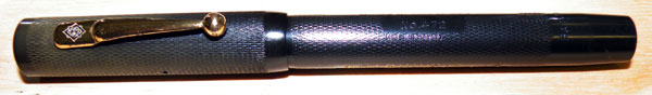 This example shows little sign of being eighty years old. The machine-chased pattern and barrel imprints are sharp, and the gold trim is very good. The end of the cap is a little faded. Perhaps it got wet or was exposed to the sun. In general, though, it’s a pen in great condition and it has a nice flexible nib, unusually for a Conway Stewart.