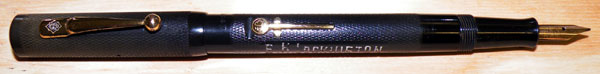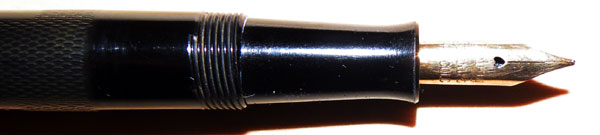 The cartouche is filled with the name E.H. Lockington – and I mean filled! The letters are large and they’ve been highlighted in white. E. H. Lockington wanted to be sure everyone knew this was his or her pen! Opinions vary about personalisations. Most dislike them, others (including me) see a value in them. Some will go to the extent of having them removed. There are two methods of doing that: heat or abrasion. Neither is for the faint of heart. Myself, I always leave them alone. They’re part of what the pen is. It’s not exactly history; I don’t know who E. H. Lockington was, and even if I did, it’s unlikely that there would be any record of the sequence of events from the pen’s first purchase until now. So pens don’t have a history, unless you consider the inferences that you might make from every scratch and scuff on a pen’s surface. From what I read in the pen boards, there are those who do consider that history. Most historians will disagree. However, judging by the excellent condition of the pen, old E. H. was proud of it and looked after it well. It would be a sad thing to break his/her association with it after all this time, so the personalisation stays where it is.