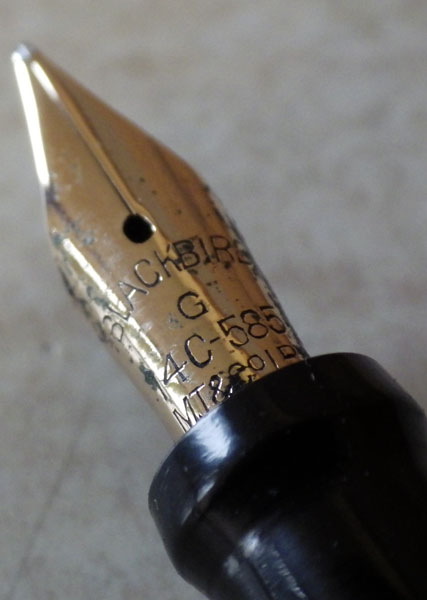 This one isn’t quite as immaculate as it looks in these pictures. The black hard rubber section is faded and the high points of the clip have lost some of their plating. Still, that’s not bad for 60-odd years. This splendid nib is still glorious and the plastic buffed up well.