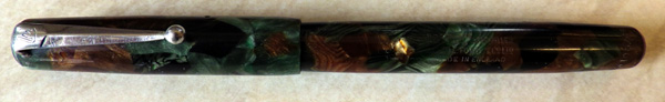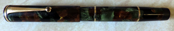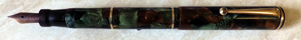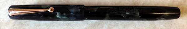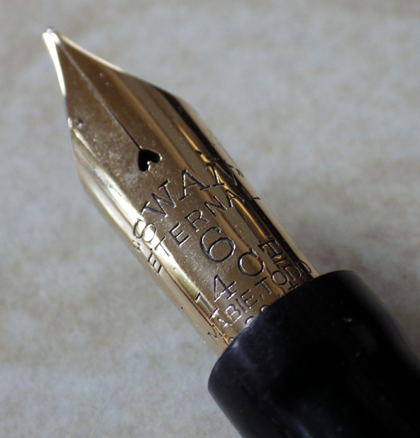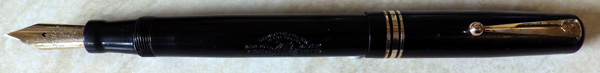 Despite the lack of a model number this pen can be dated to the war years by the centrally-positioned swan in the barrel imprint. It’s a big beast, 13.8cm capped and of course there’s that trowel-like No 6 nib. Though there are spots of wear here and there the gold plating is generally good and the pen is free of cracks, scratches and bite-marks.