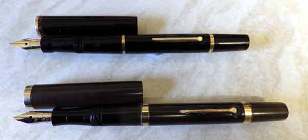 During the last couple of weeks I picked up two near-identical Swan SF1s. Both are of the more prestigious three-band variety (the bands a little broader on one than on the other) , both, oddly enough, are personalised, one to “EH” and the other to “NM Pinfold”. There aren’t many Pinfolds around; I hoped to be able to identify him but Google was not my friend today. The Pinfold pen has been used quite a bit. It’s a little faded and there is wear on the bands. The EH pen is pristine. Both have mottled hard rubber insets bearing the Swan image in the top of the cap.