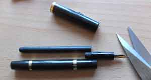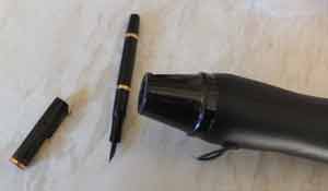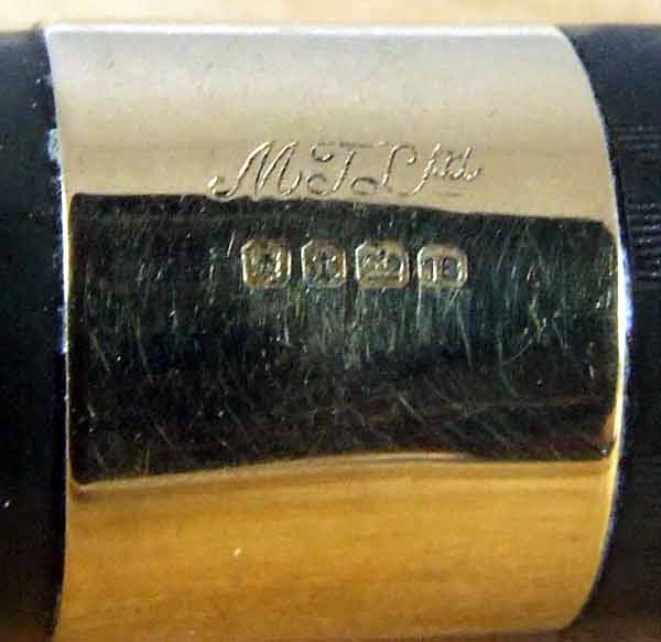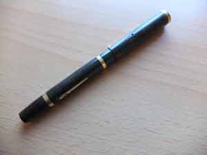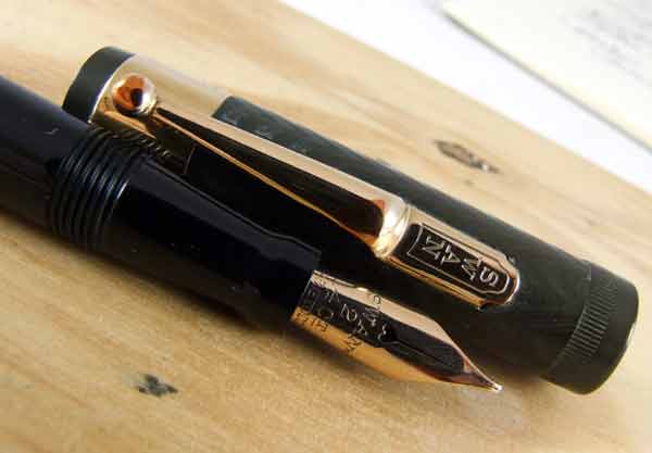 This one has no number on the barrel but we could work one out for it. It’s Leverless and has a No 3 nib, so that’s L3 It has two barrel bands and a band on the crown of the cap, so that’s another 3. There’s no band at the lip of the cap, so that’s 0 but it might be 4, because these are not the usual bands but the “stacked coin” type. The pen is black so that’s 60, so we have an L330/60, or possibly an L334/60. I favour the former.