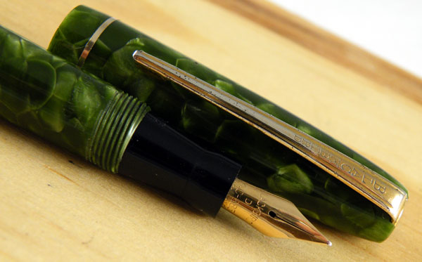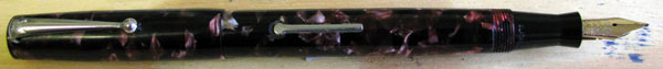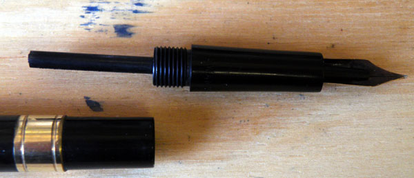 Assuming the need to disassemble further, this is one of the few occasion where using a knock-out block to remove the feed and nib would be wrong and could cause damage. Grip the feed from the rear of the section and pull it out. The nib will be left in place. Then simply pull out the nib from the front. Sometimes the feed will be stuck with dried ink. Carefully trickle water through the assembly, taking care not to soak the outside as this may cause fading.