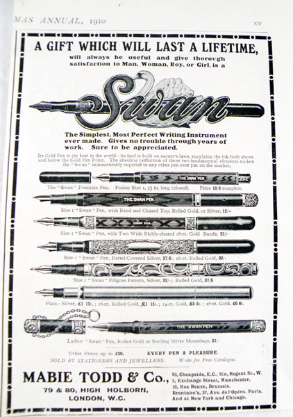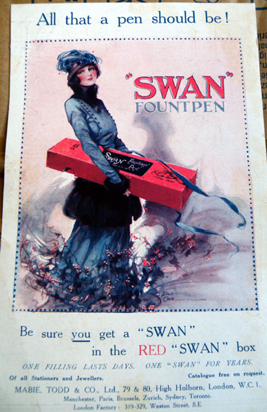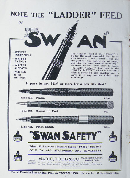 Advertisements are wonderful things. This one nails the introduction of the ladder feed for Swan pens at 1912. I have a suspicion that Mabie Todd continued to experiment with other feeds in Blackbirds for a time, but this was the date that Swans adopted the ladder feed which they retained right to the end.