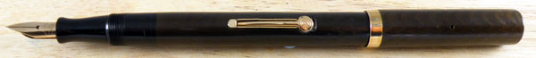 This is the Lady Patricia, issued around 1930 as the distaff addition to the Patrician, which it resembles in the materials used but in no other way, really, except for the lever box. It’s a simple and elegant design in its own right, shown off by some of the best celluloid Waterman ever employed.