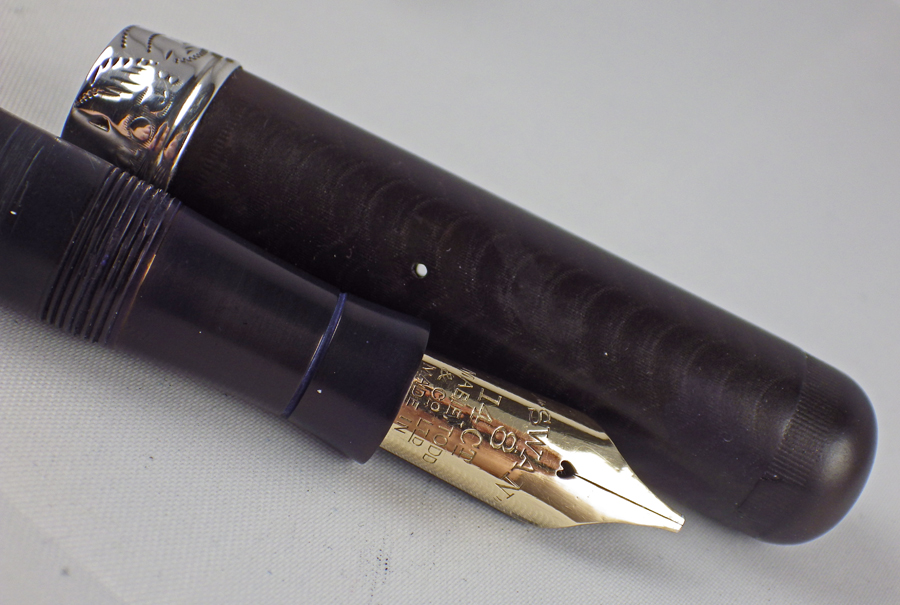 Ten minutes later, having scrubbed most of the peskily persistent ink off my hands and equipped myself with nitrile gloves, I disassembled the pen under the running tap. (That’s a faucet, by the way.) The converter fell apart. I gathered up its remains and threw them in the trash. I washed the ink off the pen and dried it carefully. I dug around and found one of those short international cartridges. It inserted into the pen with no problems and there were no leaks. I tried writing with the pen again and there were no disasters. The pen wrote beautifully, somewhere between a European fine and a medium. It’s not ideal, I would have to say. It’s heavy. I usually post my pens and this one will post adequately well but then it becomes very heavy indeed. The shape is peculiar. I think it was designed to show off the dragon rather than to fit the hand well. Nonetheless, it graces my desk and I’ll use it for note-taking and signing until the cartridge runs out.